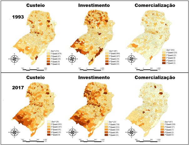 Para aprofundar a análise, a Figura 2 apresenta a distribuição do crédito pecuário conforme sua finalidade nos triênios de 1993 e 2017, permitindo uma comparação e visualização da concentração desse crédito na região Sul. A figura destaca as mudanças na demanda por crédito voltado para custeio, investimento e comercialização, evidenciando transformações significativas ao longo do tempo. Os números entre parênteses indicam a quantidade de municípios em cada quantil, sendo que cada grupo representa os municípios que acessam 20% do crédito total médio do triênio no respectivo intervalo. Esses quantis estão ordenados do primeiro ao quinto, com este último composto por um número reduzido de cidades que concentram o maior volume de crédito.